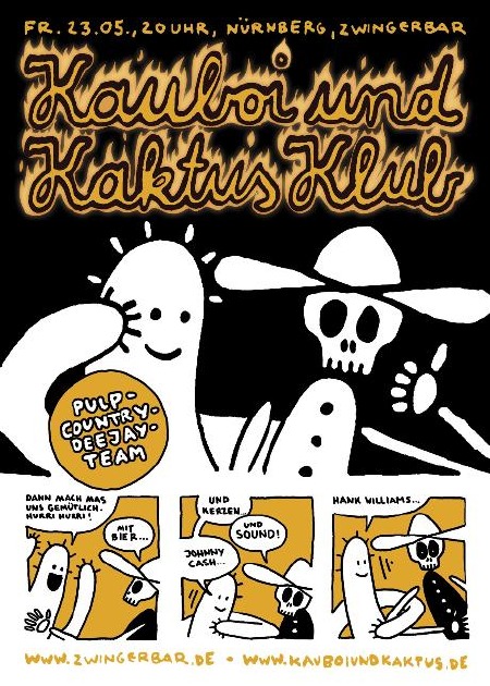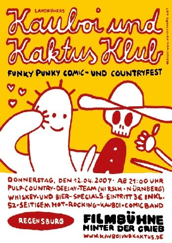 SPECIAL: Donnerstag, 02.07.,ab 21.00: Release-Party für das Comic: Zum Teufel-Kauboi & Kaktus Vol. III Donnerstag, 02 Juli, Startzeit 21:00 PM Filmbühne hinter der Grieb, Hinter der Grieb 8, Regensburg, 93047, heiße Comic-Helden, coole Drinks, scharfe Sounds und diverse Gespräche über Gott, die Welt, den Teufel und Countrymusic... .............................................................................. SPECIAL: Samstag, 29.08. 2009 19.00 - 20.30. Uhr Dark-Cruise-Sounds: Aftercruiseparty im Z-Bau, Frankenstr. 200 pulp-country-music, dann weitere Deejays, Livebands, Cocktailbar, Grill-Action nach dem Nürnberger Cruiser-Treff 2009, supported by: thunderbird / RUN NGB / SouthSideRollers
