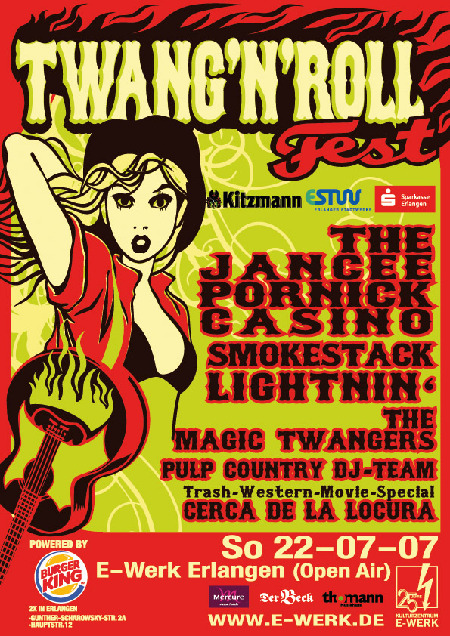 (25 Jahre E-Werk) Sonntag, 22. Juli 2007 - 16:00 Uhr Es ist wieder soweit und wir beglücken euch mit TWANG'N'ROLL der ganz feinen Sorte. Den Anfang machen SMOKESTACK LIGHTNIN', die Helden unter den deutschen Country-Stuntmännern. JANCEE PORNICK sind deutschlandweit berühmt berüchtigt für ihren kompromisslosen Las-Vegas-Russen-Surf-Punk'N'Roll.
